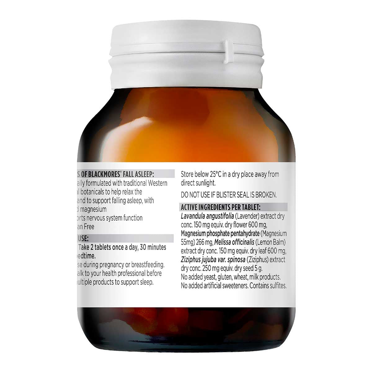 Blackmores Fall Asleep This triple action formula uses ingredients such as magnesium as well as traditional herbs including lemon balm and lavender, traditionally used in Western herbal practice to support mind relaxation and ziziphus, traditionally used in Chinese practice to support a restful sleep.