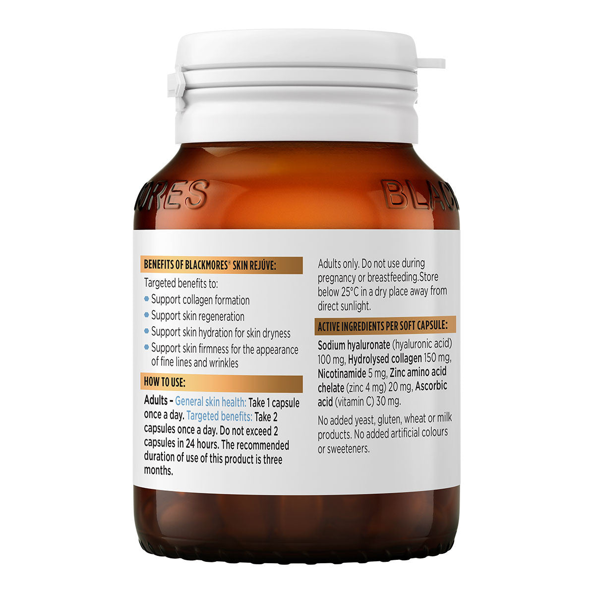 Blackmores Skin Rejuve: Specially formulated with hydrolysed marine collagen, hyaluronic acid, nicotinamide, zinc and vitamin C, providing nourishment for healthy skin from the inside out, with targeted support for skin firmness, elasticity and skin hydration.