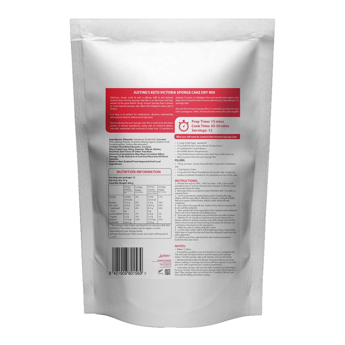 This Keto Victoria Sponge Cake Mix is made from the finest quality of natural ingredients, made with no wheat and gluten, naturally sweetened with erythritol and takes only 15 minutes to prepare. It tastes so indulgent that you would never guess one plain slice of Justine’s Keto Victoria cake has just 2.4g carbs per 12 servings size.