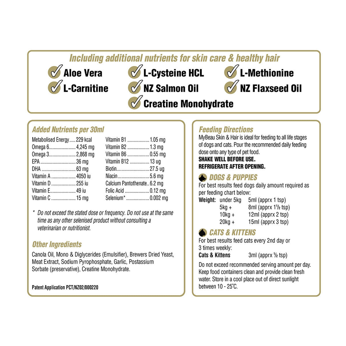 mybeau Skin & Hair contains added aloe vera, L-cysteine HCl, L-methionine, L-carnitine, NZ flaxseed oil and NZ salmon oil as key ingredients that have been shown to provide the nutritional building blocks to support healthy skin and hair in dogs and cats of all life stages.
