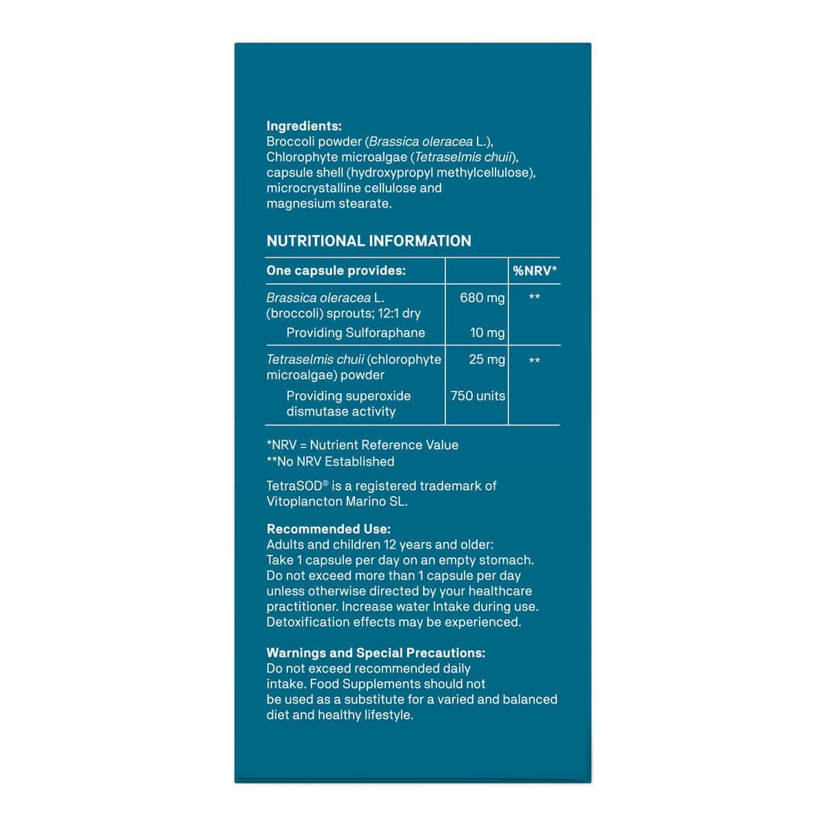 Natroceutics sulforaphane is delivered by glucoraphanin + myrosinase from broccoli sprouts. This product is further enhanced by TetraSOD from green marine microalgae shown to increase primamry antioxidants.