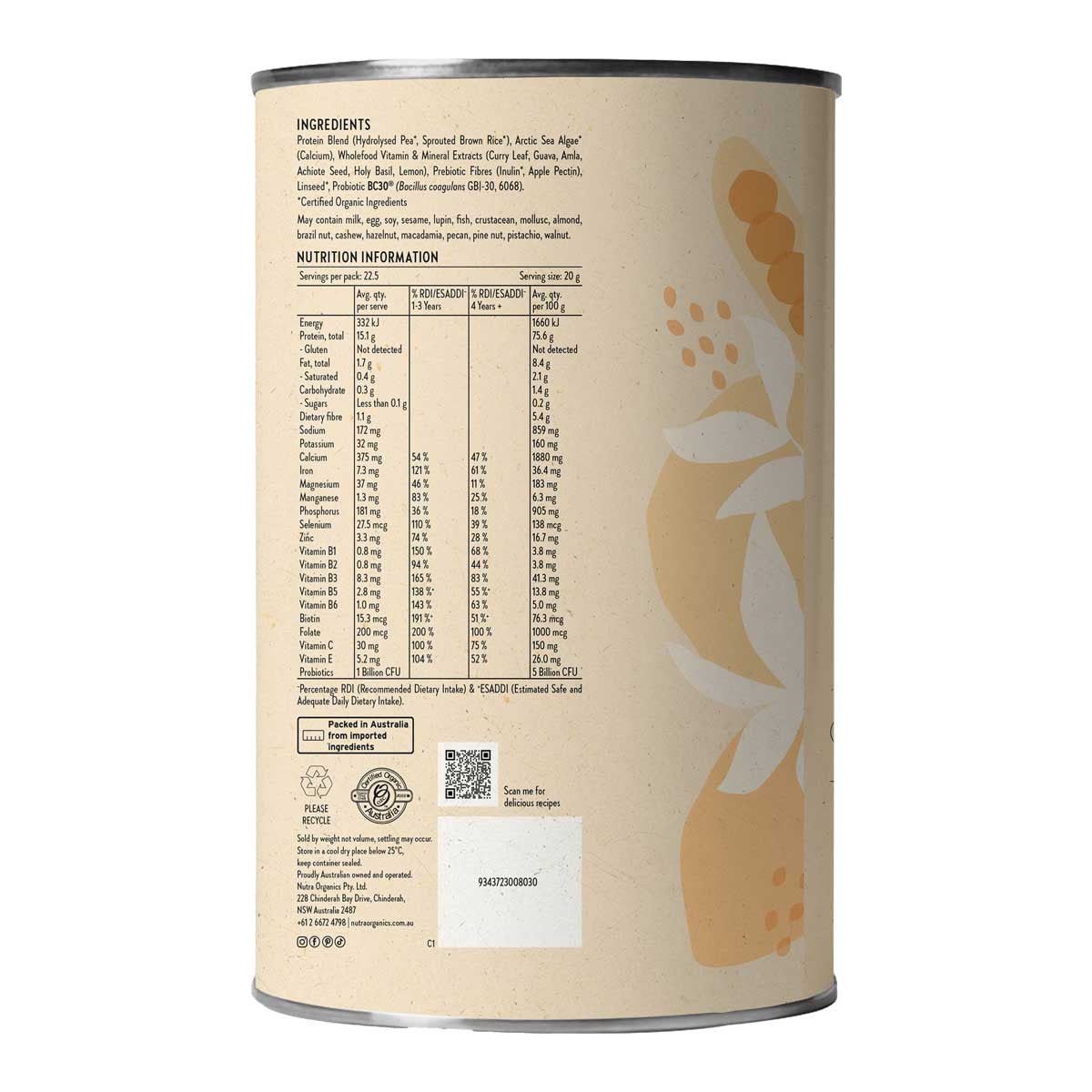 Protein Blend (Hydrolysed Pea*, Sprouted Brown Rice*)Arctic Sea Algae*Wholefood Extracts (Curry Leaf, Guava, Amla, Achiote Seed, Holy Basil, Lemon)Prebiotic Fibres (Inulin*, Apple Pectin)Linseed*Probiotic BC30® (Bacillus coagulans GBI-30, 6068)*Certified organic ingredients May Contain: Milk, egg, soy, sesame, lupin, fish, crustacean, mollusc, almond, brazil nut, cashew, hazelnut, macadamia, pecan, pine nut, pistachio, walnut.