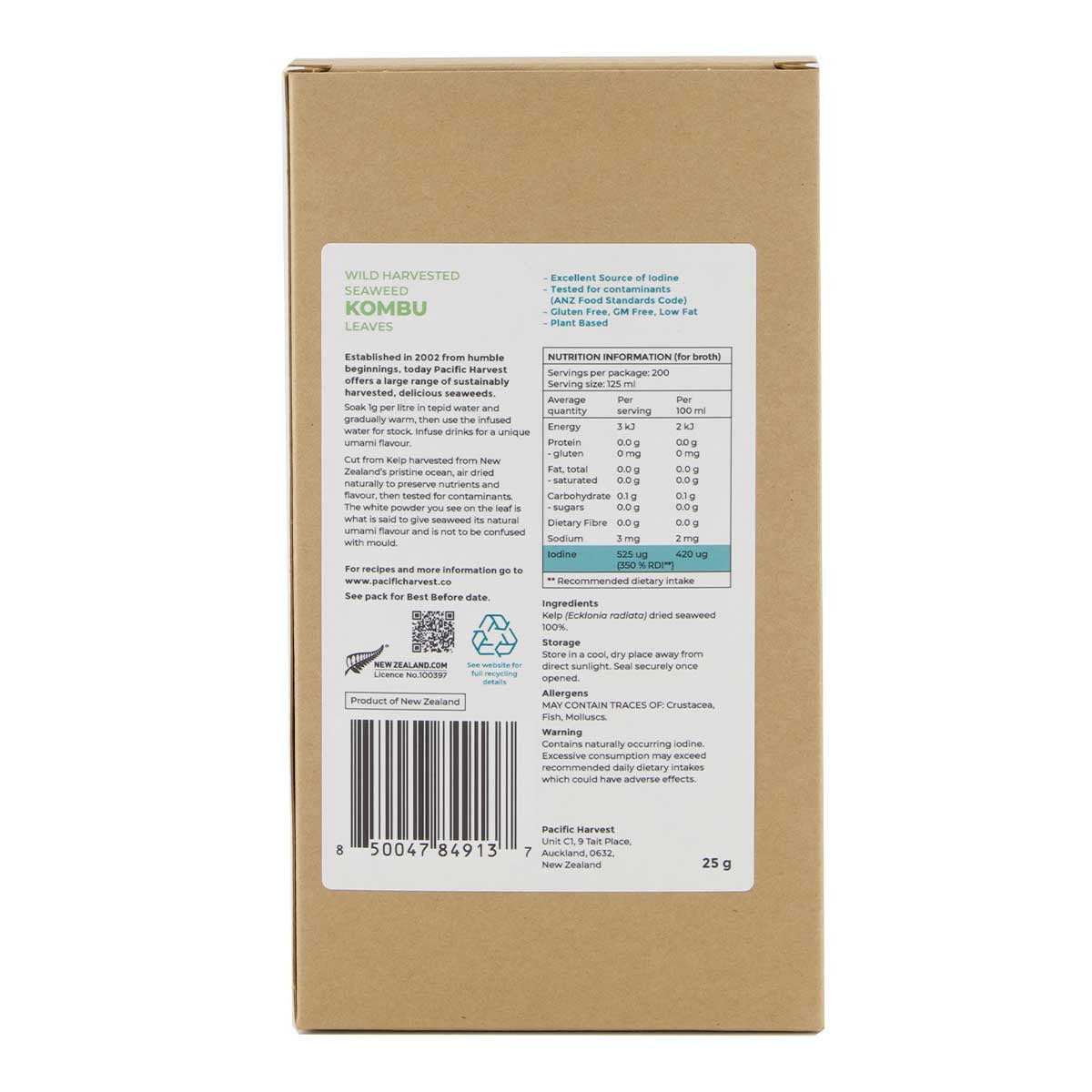 Pacific Harvest Kombu Leaves are cut from Kelp harvested from New Zealand's pristine ocean, air dried naturally to preserve nutrients and flavour and then tested for contaminants.
