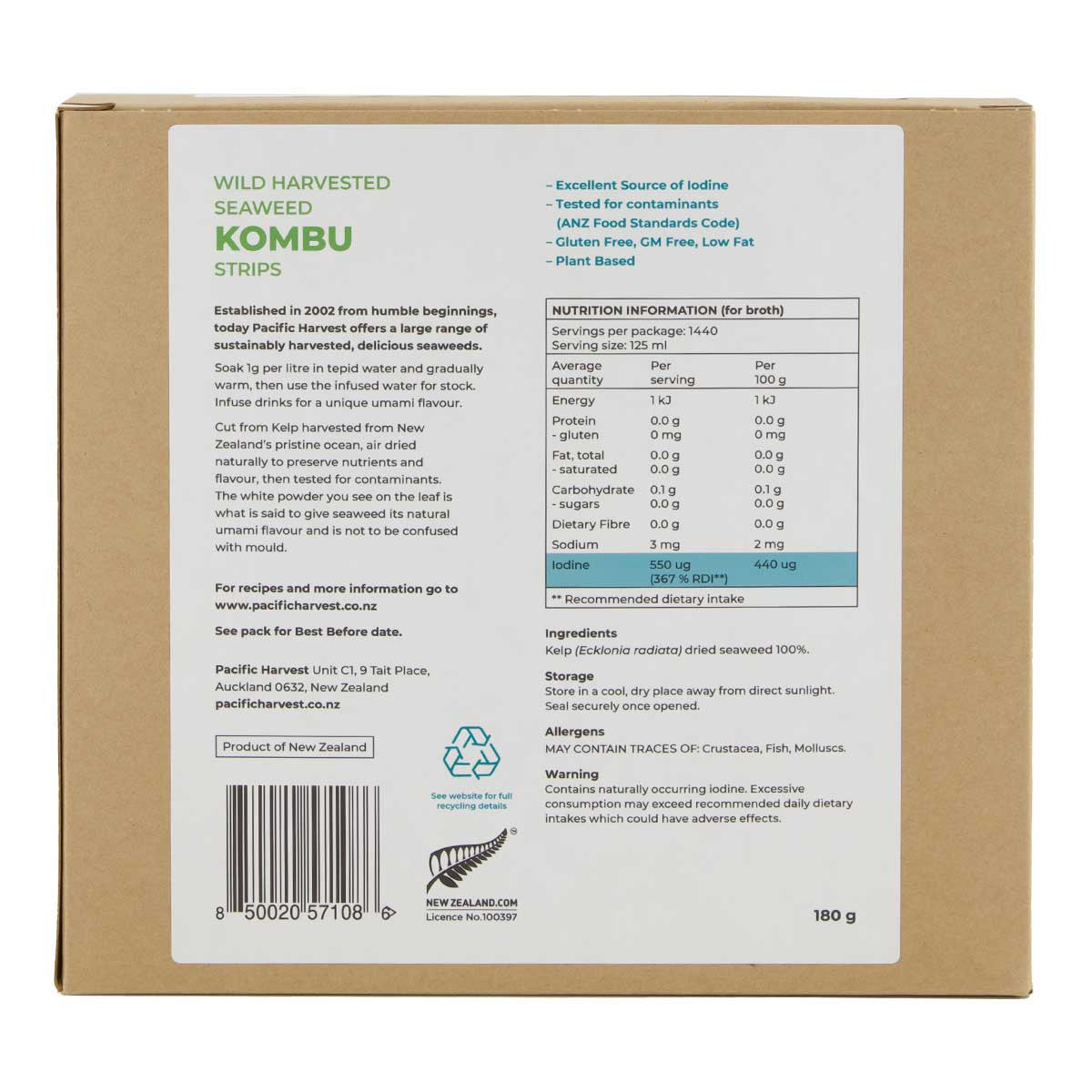 Pacific Harvest Kombu Strips are simply kelp dried whole, Japanese style. Dashi Kombu, the strip is thick & flavourful and lends itself perfectly to stock making. Kombu is simply kelp dried whole and cut in pieces. Kombu leaves are attached to the central section of the plant; they are more pliable and lend themselves to wrapping food for cooking.