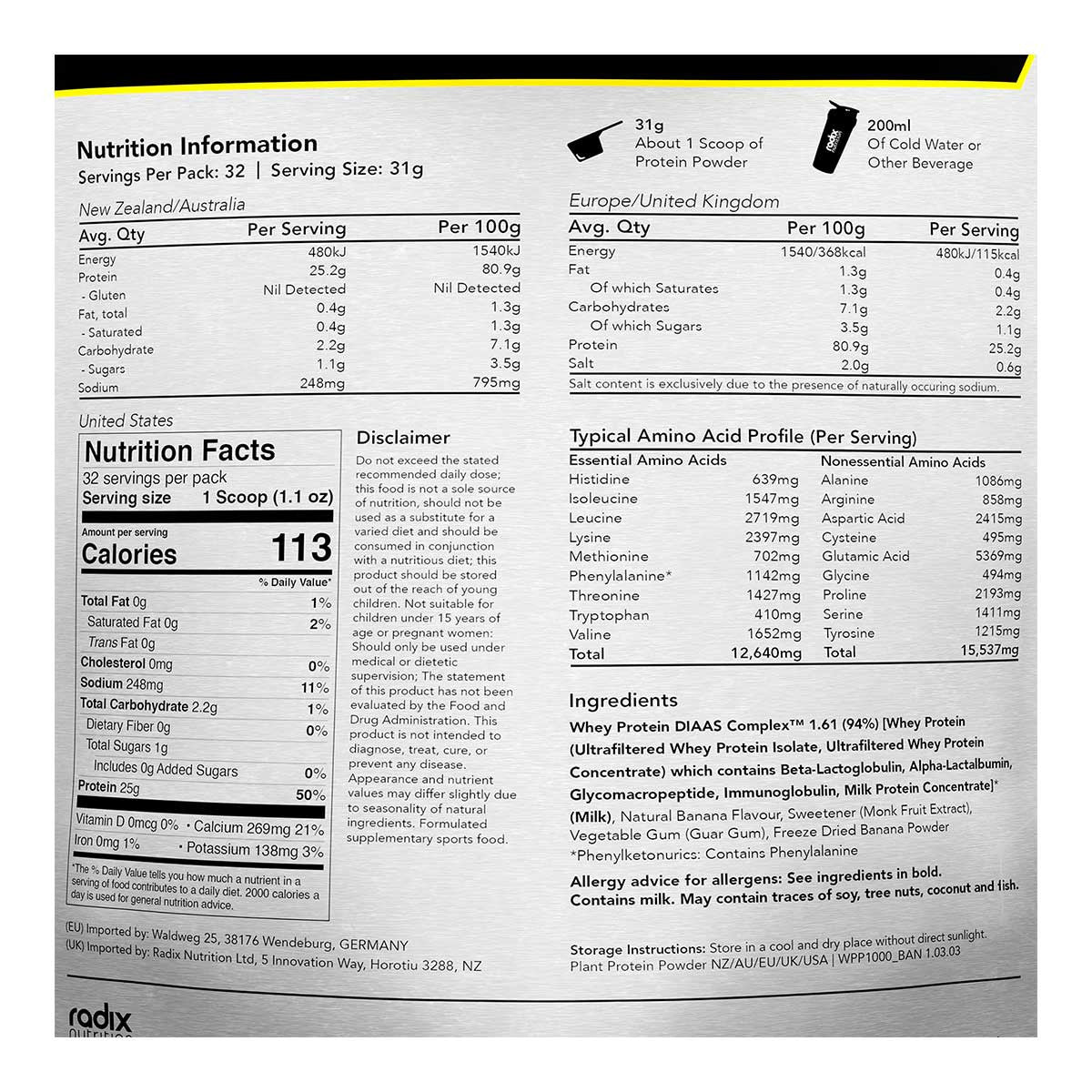 Radix Nutrition Whey Protein DIAAS Complex 1.61 Powder - Banana is made from ultra-filtered whey protein isolate, ultra-filtered whey protein concentrate & ultra-filtered milk protein concentrate.