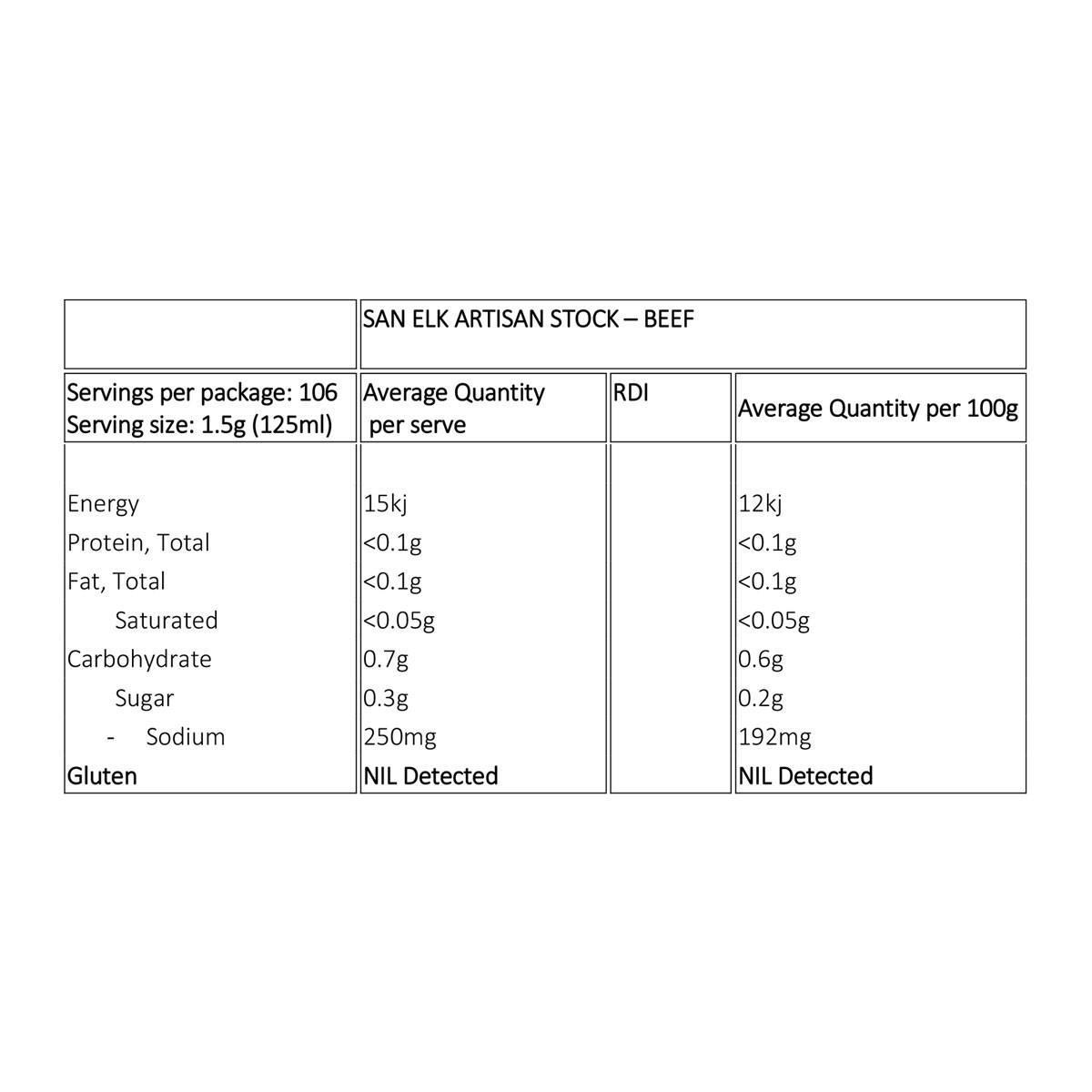 San Elk Artisan Stock Beef Bone is certified organic artisan beef stock. Each batch is handcrafted using premium ingredients, dehydrated and finely ground to create a nutritious flavoursome stock. San Elk uses boiled beef bones in their stock that creates a milder flavour profile and is lighter in colour.