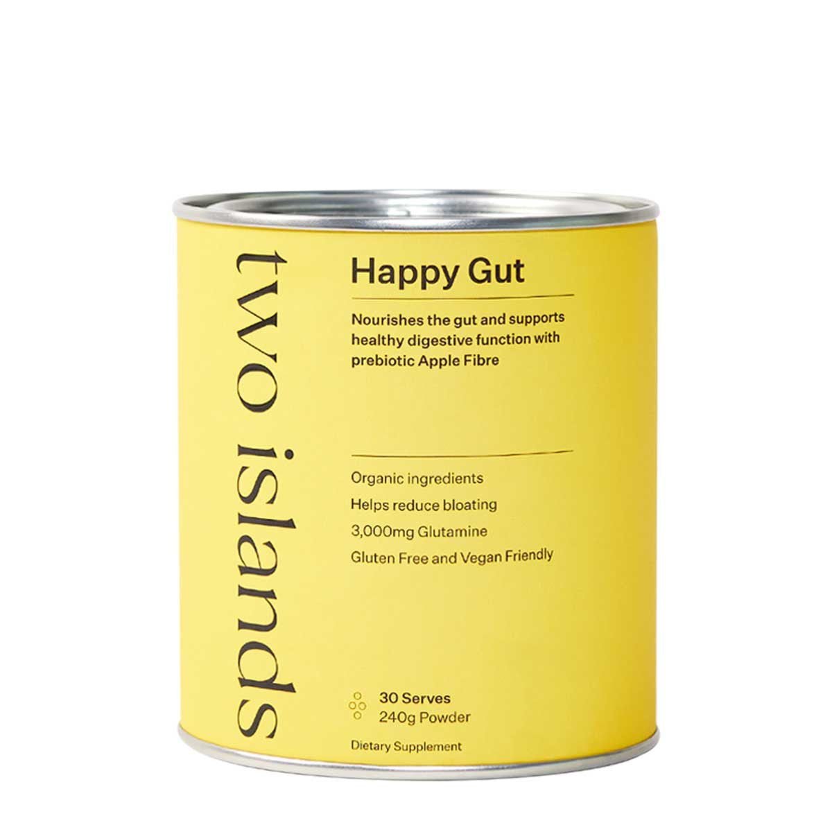 Two Islands Happy Gut: Combining a high dose of glutamine with soothing herbs including slippery elm, chamomile and ginger, Two Islands Happy Gut supports gut health and overall digestion for a happy gut.