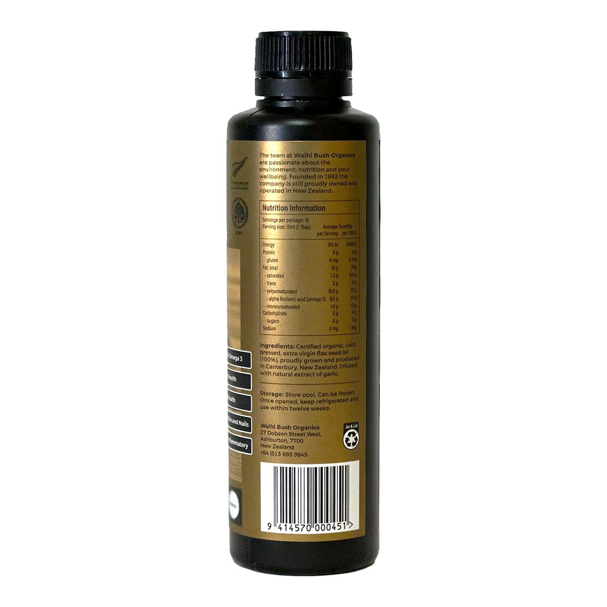 Waihi Bush Flax Seed Oil Garlic: Pure New Zealand grown, cold pressed and fully traceable flax seed oil original infused with the flavour of garlic.
